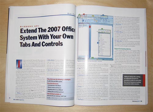 Today I got my dead-tree copy of my first 'real' published magazine article. It's in MSDN Magazine and is about the new UI in Microsoft Office. It made the lead article for the February 2007 issue, and they even used a diagram I drew on the cover. Sweet! 🙂