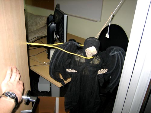 The idea was that opening the door quickly would cause the Angel of Death to pop up from the shadows and startle the victim. The bright yellow network cable probably looked suspicious as the door was opening up, but we had to make do with the supplies in the office.